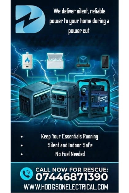 Emergency Power Cut Assistance Emergency Power Station Rental & Backup in WakefieldSuffering a long power cut in Wakefield? Whether your freezer is full of food, you work from home, or you rely on critical equipment, a power cut doesn't have to bring everything to a standstill. Hodgson Electrical provides an emergency portable battery power station rental service — we deliver a fully charged unit straight to your door, set it up, and keep you running until the grid is back.Call Dan on 07446 871 390 and we'll get to you as quickly as we can.A Different Kind of Electrical EmergencyMost people think of an electrician when something goes wrong with their wiring — but power cuts are a different problem entirely. When the grid goes down and there's nothing you can do but wait, having access to a high-capacity battery power station can make a significant difference to your comfort, your finances, and in some cases, your safety.We keep charged units ready to go so that when you call, we can get out to you fast.What You Can PowerA high-capacity battery power station is more capable than most people realise. Here's what we can help you keep running during a power cut:Save Your Food — A full fridge or freezer represents a lot of money, and food spoilage during a prolonged outage can be a costly problem. We can keep your fridge and freezer running for hours, protecting everything inside until your power is restored.Stay Connected — Working from home or just need to stay in touch? We can power your WiFi router, keep laptops charged, and make sure your phones don't run out of battery when you need them most.Critical Equipment — For some households, a power cut is more than an inconvenience. Whether it's a fish tank pump that can't afford to stop running or medical equipment that needs a reliable power source, we take these situations seriously and will prioritise getting to you.How It WorksWe've made the process as simple as possible. Give Dan a call on 07446 871 390 and let us know your situation. We'll bring a fully charged battery power station to your property, set everything up so your essential appliances and devices are connected and running, and then collect the unit once your power has been restored. No fuss, no complicated setup on your part — we handle it all.Available Across Wakefield and Surrounding AreasWe cover Wakefield and the surrounding areas including Pontefract, Outwood, Sandal, Walton, Crofton, and Sharlston. When you're dealing with a power cut, the last thing you want is to wait around — so call us directly for the fastest response.Don't Wait it Out — Call Hodgson ElectricalPower cuts are unpredictable, and they always seem to happen at the worst possible time. With Hodgson Electrical's emergency power station rental service, you don't have to just sit in the dark and hope for the best.Call Dan on 07446 871 390, email contact@hodgsonelectrical.com, or use our contact form — and we'll get you sorted.